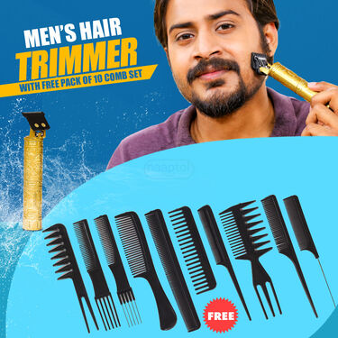 Experience precision grooming with the Men's Hair Trimmer and Free Pack of 10 Comb Set. Crafted with self-sharpening stainless steel blades, enjoy fast and safe clipping on all hair types. The rechargeable battery ensures up to 120 minutes of cordless use, while the T-shaped design offers close trimming options. This professional set includes various combs for versatile styling and a convenient foldable package for on-the-go grooming. Perfect for hair clipping, styling, and achieving a flawless shave, it's an essential tool for every grooming routine