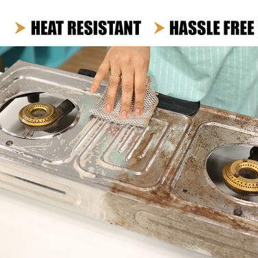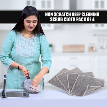 Introducing the Non-Scratch Deep Cleaning Scrub Cloth Pack Of 4. This pack offers quick and convenient cleaning with its double layer wire mesh cloth. It's gentle on surfaces yet powerful on tough stains, making it ideal for dishes, pots, pans, and countertops. The silver wire knitted surface ensures effective cleaning without scratching. With its heat resistance, it can be used for holding hot items and in hot tandoors. Durable and reusable, it maintains excellent elasticity and resilience, providing superior protection against cuts and punctures. Experience efficient cleaning without the hassle, and keep your hands protected from harsh detergents and grime