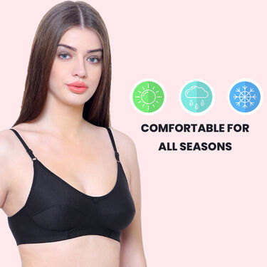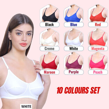 Introducing a pack of 10 full coverage bras designed to provide comfort and confidence to women of all sizes. This unique deal offers a set of bras in vibrant shades, covering all your outfit needs. With sizes ranging from 34 to 46, including DD cups, it ensures a perfect fit for every body type. The breathable fabric minimizes the risk of skin irritations caused by sweat, making it ideal for hot and humid summers. Featuring medium thin straps for added comfort and coverage, these bras are a must-have wardrobe essential. Rotate your bras regularly during summers to reduce sweat and prevent skin rashes. With soft fabric that doesn't cause redness or discomfort, these bras are designed for daily wear and easy maintenance