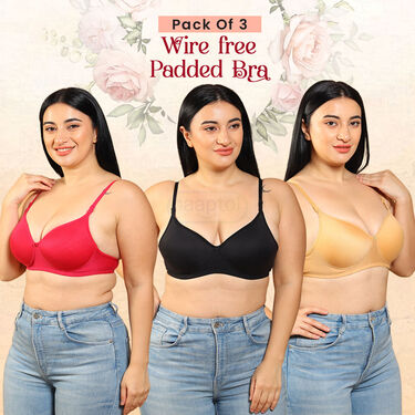 This pack of 3 wirefree padded bras offers comfort and support for everyday wear. Made from soft poly-cotton fabric, these bras are skin-friendly, odor-free, and easy to wash at home. The neutral colorsâ??magenta, black, and beigeâ??make them perfect for matching with various outfits. Designed for all-day use, they provide a comfortable fit without the bulky weight. Ideal for sports, special occasions, and regular wear, they cater to women of all ages. The brasâ?? stretchy material ensures gentle support, especially suitable for pregnancy. With no ironing required, maintenance is hassle-free. Available in sizes 32 to 40